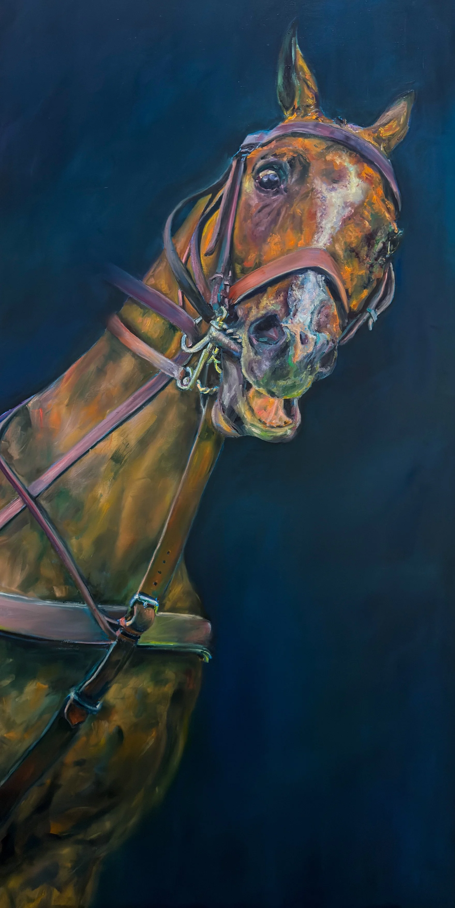I thought a lot about the background and who would be holding the reins for this painting, and ultimately decided to reflect the fact that authoritarianism strips you of your context. You are not free to explore your agency under this rule, you exist in a disorienting, overwhelming, colorless void, absent from purpose and connection. And while, one person may be leading the charge, the reins are really in the nebulous hands of the people willing to enforce compliance. This can make it challenging to identify immediate threats and untangle the web of power, as you are forced to fight battles on all fronts to exhaustion.