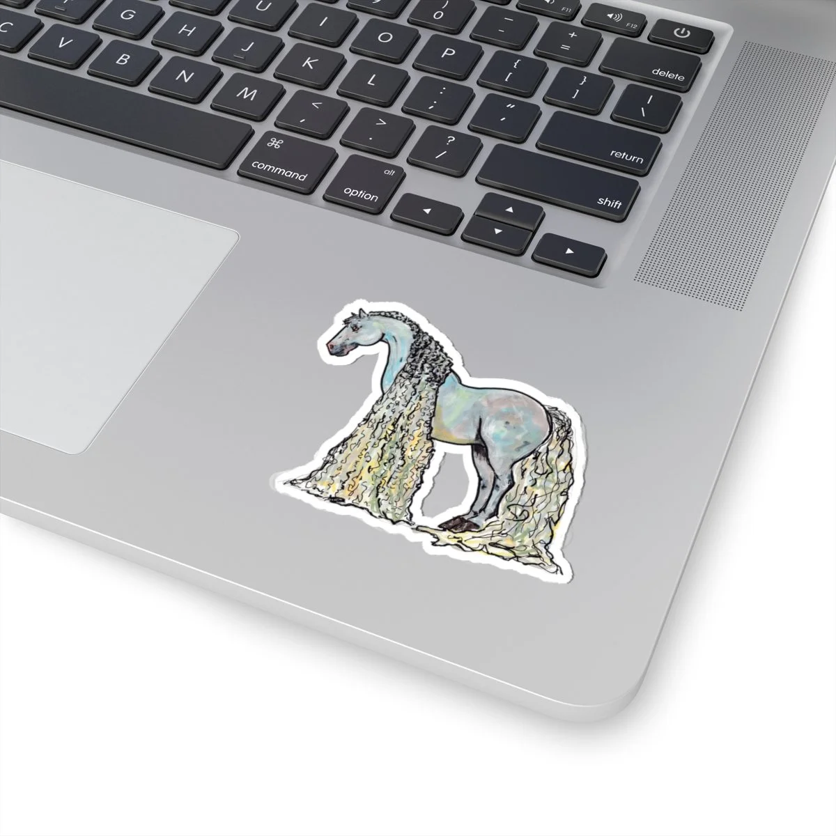 Based off an illustration of mine, this sticker features a grey romantic horse with flowing mane and tail.